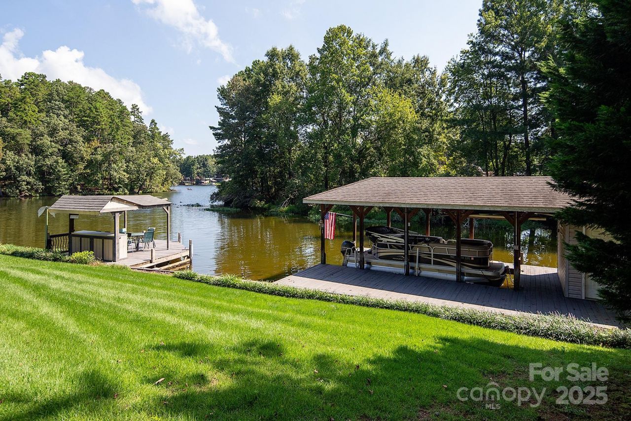 Experience refined lakefront living in this secluded Lake Tillery retreat, offered mostly furnished for a seamless transition into your private waterfront lifestyle. Nestled among lush, professionally designed landscaping, the property captures breathtaking water views and exceptional outdoor living with a private 1-slip boathouse, charming gazebo, and two expansive screened porches perfectly positioned for serene mornings and sunset evenings overlooking the lake. Inside, the main-level great room is filled with natural light from dramatic windows that frame the waterfront backdrop, creating an inviting yet sophisticated gathering space. The primary suite serves as a true sanctuary, featuring soaring wood ceilings, generous closet space, and a spa-inspired bath complete with a dual-head walk-in shower, jetted soaking tub, double vanities, and granite countertops. The thoughtfully designed kitchen showcases stunning Brazilian granite, abundant workspace, and an exceptional layout ideal for both everyday living and entertaining. A standout bonus room provides versatile space perfect for a home office or additional guest accommodations. The lower level is designed for entertaining and recreation, featuring a stylish dry bar with mini refrigerator and microwave, along with a spacious workshop and additional garage area for hobbies, storage, or lake gear. Comfort meets peace of mind with premium upgrades including a full-home Generac generator and LeafFilter gutter protection system, ensuring low-maintenance living year-round. Cozy yet sophisticated, private yet welcoming, this exceptional property embodies the ultimate luxury lakefront retreat.