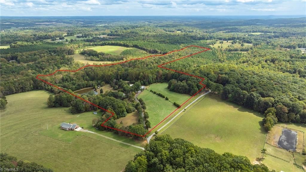 Secluded farm estate on almost 40 acres in Climax, NC! A dream for sustainable living, equestrian pursuits, or a private retreat. The charming main farmhouse features a metal roof, spacious wrap-around porch, 3 beds/3 baths, and a cozy fireplace. Inside, the rustic-chic kitchen boasts extensive wood paneling, wood floors, and a center island. A separate guest house and outbuildings provide flexible space. Car enthusiasts and hobbyists will love the oversized 3-car garage with cabinetry and abundant workspace. The tranquil grounds include a stocked lake with a dock, a substantial barn with horse stalls, 3 paddocks for small farm animals, and pastures ready for farm animals. The acreage is partially cleared/wooded with ultimate privacy, nature trails, extensive garden space, and many possibilities. Many unique features and historical charm! Embrace the ultimate country lifestyle while living only minutes from city amenities!