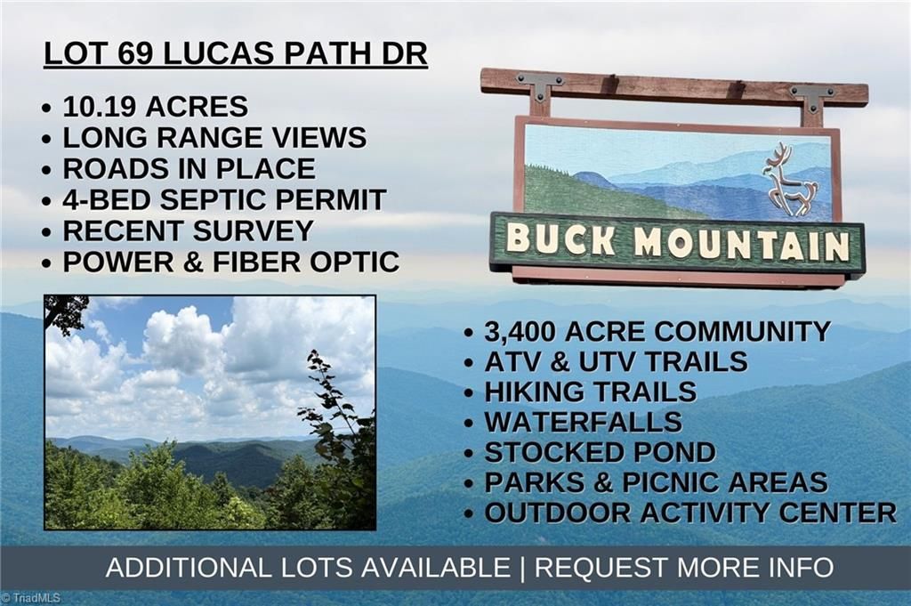 10+ Acres w/BIG VIEWS! Lot is ready for your mtn home! ELECTRIC + FIBER OPTIC already on lot. RECENT SURVEY 10/2/25. CURRENT 4-bedroom septic permit valid through Sept. 2032, driveway in place to prepared bldg site featuring LONG RANGE VIEWS, privacy & seclusion. CREEK on lot near bottom. Looking for a quiet mtn place to build a weekend getaway? Conveniently located in 3,400 acre Buck Mtn, ONLY GATED ATV COMMUNITY in Wilkes County. Long & short-term rentals allowed. PRIME LOCATION! Only 1 hr from Winston & 1 hr 40 min from Charlotte. Just minutes from High Country activities. Centrally located 35 min from Boone, West Jefferson & Wilkesboro. Near BLUE RIDGE PKWY, ASU, shopping, dining, golf, wineries, breweries, mtn biking & skiing. BUCK MTN AMENITIES: ATV & Hiking Trails, Parks, Fishing Pond, Water Falls, Pavilions, Community Center, Helipad, Outdoor Activity Center w/amphitheater for live music. 1,400 SF min to build. NO TINY HOMES. NO MOBILE HOMES. NO CAMPING. NO SELLER FINANCING.