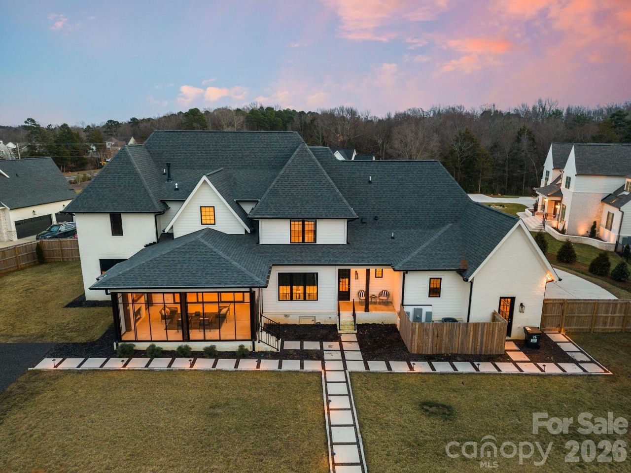 Experience luxury living on a rare 1-acre homesite in an exclusive enclave of just five custom homes. This over 4500 sq ft residence blends modern design with exceptional functionality, offering 5 bedrooms, 5.5 bathrooms, and multiple ensuite retreats ideal for multi-generational living or hosting guests in comfort.The main level features a stunning open-concept layout with vaulted ceilings, exposed beams, and a dramatic chandelier anchoring the great room. Oversized windows and sliding glass doors fill the space with natural light and create a seamless connection to the outdoor living areas. The primary suite is conveniently located on the main floor, providing privacy and ease of access.Upstairs, a spacious loft and a large bonus room offer flexible spaces for work, play, or media. Every bedroom is generously sized, with several featuring private ensuite baths.Step outside to your own private resort. The fully fenced backyard includes a sparkling pool, a half-court basketball court, and a screened-in porch perfect for year-round entertaining. Thoughtful landscaping, a manicured lawn, and custom hardscaping complete the outdoor experience.With its rare acreage, custom construction, and unmatched amenities, this Huntersville home delivers the space, privacy, and lifestyle today's buyers are seeking.
